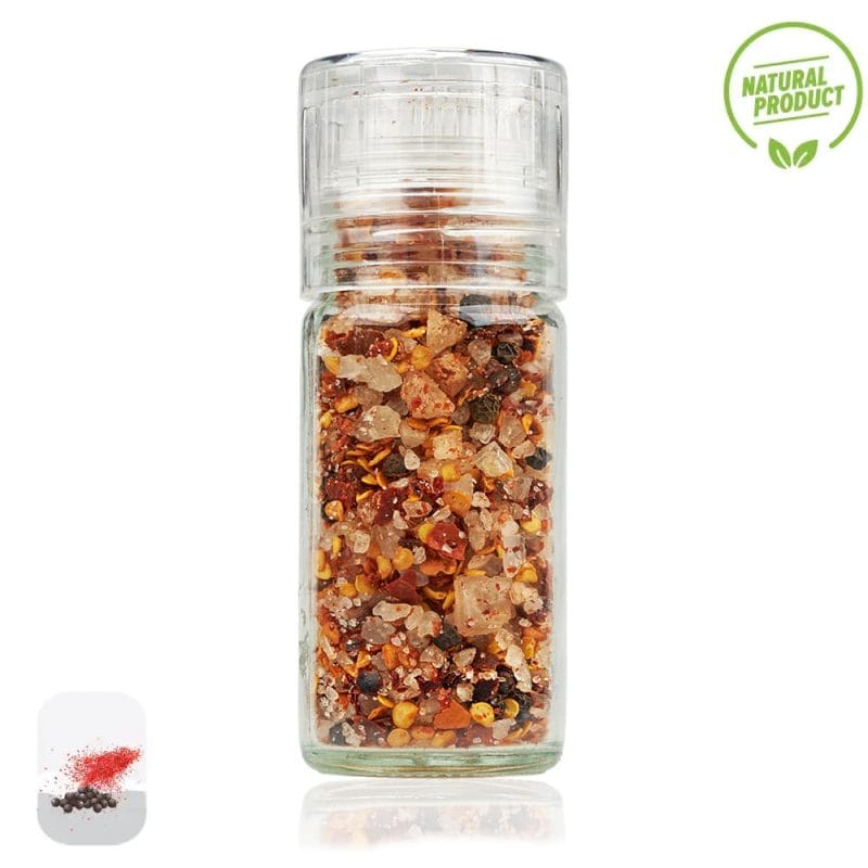 Αγνό θαλασσινό αλάτι από τους πρόποδες του Ολύμπου με αποξηραμένη καυτερή πιπεριά Φλωρίνης, μπούκοβο και μαύρο πιπέρι. Γευστικό , αρωματικό και πικάντικο!