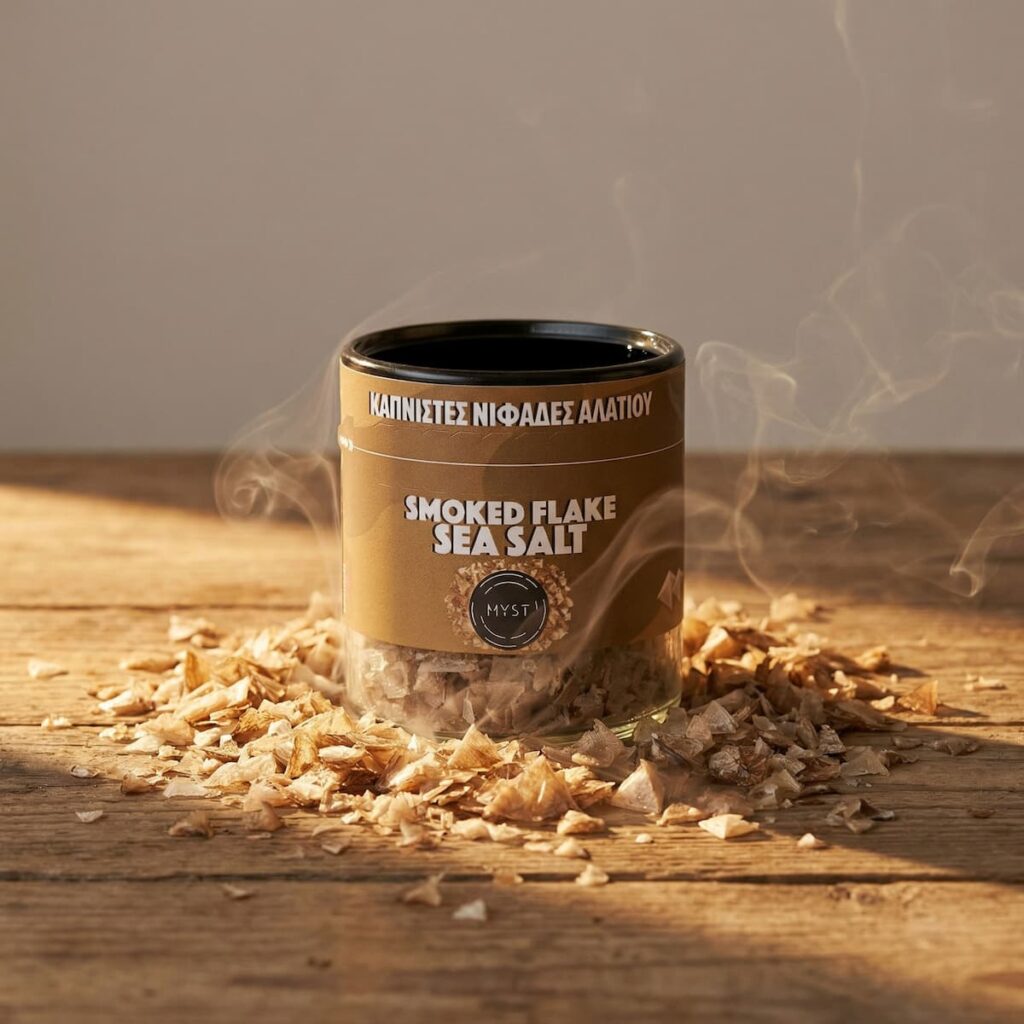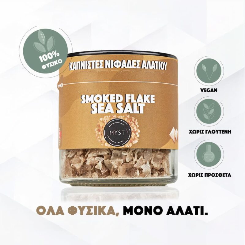 Οι καπνιστές νιφάδες θαλασσινού αλατιού καπνίζονται αργά πάνω σε φυσικό ξύλο δρυός, αποκτώντας ζεστό, βαθύ και καθαρό καπνιστό άρωμα. Η διαδικασία γίνεται με προσοχή ώστε να διατηρείται η τραγανή υφή και το χαρακτηριστικό πυραμιδοειδές σχήμα, το οποίο συγκρατεί το άρωμα και προσφέρει ένταση χωρίς πικράδα.