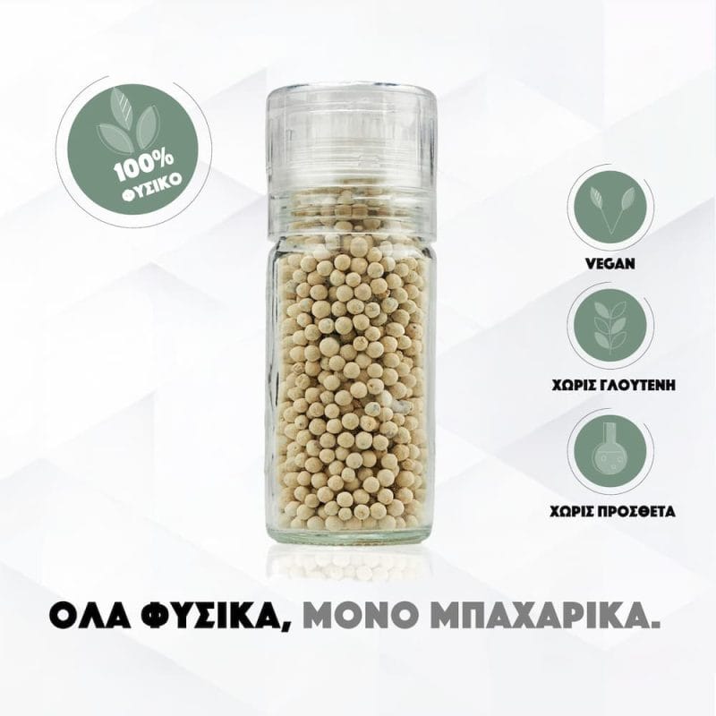 Πικάντικο αλλά εκλεπτυσμένο — για φίνα γεύση χωρίς να αλλοιώνει το χρώμα του φαγητού. Εκλεκτοί κόκκοι λευκού πιπεριού, με πιο ήπια και διακριτική γεύση από το μαύρο, αλλά εξίσου πικάντικη.